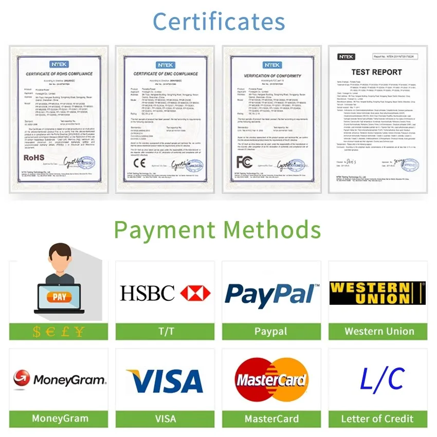 A : Trade assurance, TT (Bank transfer), Western Union,Money Gram, Paypal,etc (100% payment before shipment for plain orders.)
