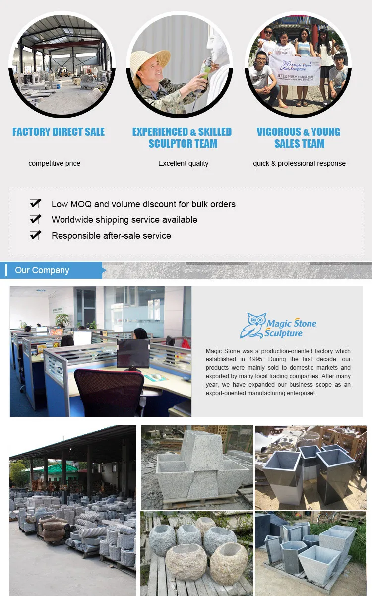 Magic Stone owns two factories which are located in Quanzhou city. Besides, we cooperate with another three factories in North of China, to provide wide range of stone sculptures for clients, thus competitive price and high standard quality can be ensured. Magic Stone are especially professional in produce stone garden birdbath, animal ornaments, water fountains, basalt garden landscapes, etc.