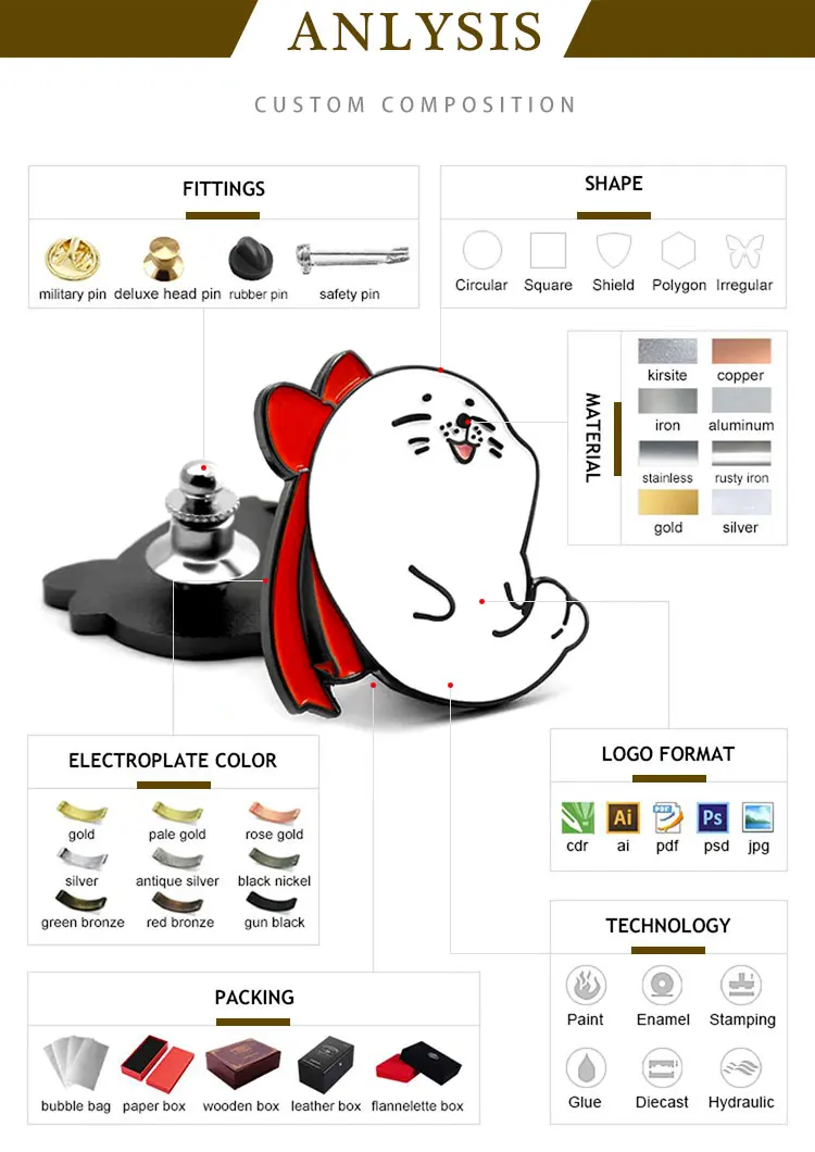 Color | Soft enamel / hard enamel /printing with epoxy coating | ||||||