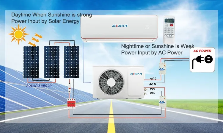 While Inverter Air Conditioners are more powerful and use less energy than a fixed speed air conditioner, Recreate new Solar Hybrid Inverter takes this to a new level of efficiency. The world's first true Solar DC inverter air conditioner allows you to convert the suns energy through Photovoltaic panels into DC power that is feed directly into the DC Compressor. Air conditioner combined between both 2 powered ( AC power , DC power ) both 2 power can work seamless and change between both powers happened automatic depend in sunshine. Air conditioner use solar panel direct power as priority power while grid will be used as a backup only, This technology can let you and your family us air conditioner with free power ( sun power ).