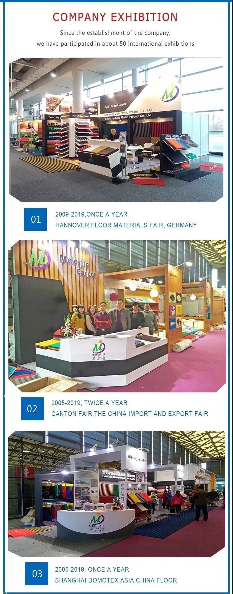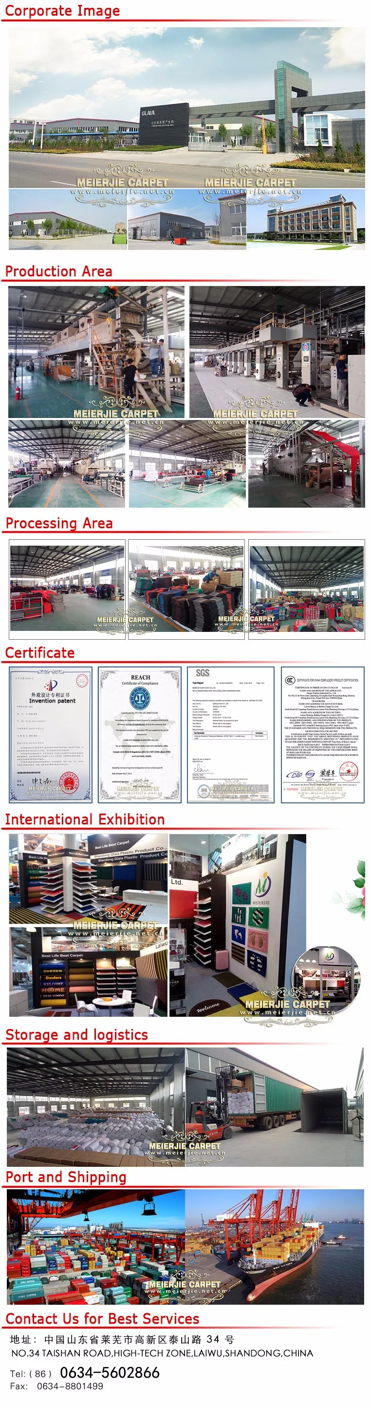 Welcome to MEIERJIE Plastic Mat Alibaba flagship store.my friend. Our company was founded in 2003,with 14 years of experience in design, production and international trade of plastic floor Mats.Our company now covers an area of 86666 square meters, including 10 workshops, office building and dormitory building. Our company has ten the most advanced production line, with an annual output of billions dollars.The products are exported around the world, and establish long-term cooperation with domestic big dealers, trading company, brand chain store supermarket and so on.