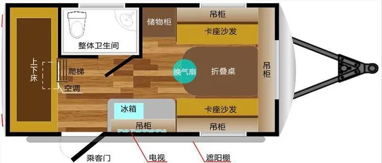 Adjustable external power port | Two-way ventilation skylight | 200W solar power charge(Half of the flexible plate) | Manual awning(3*2.5) | |||
