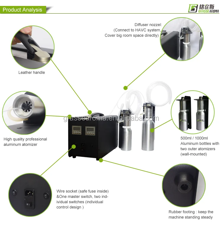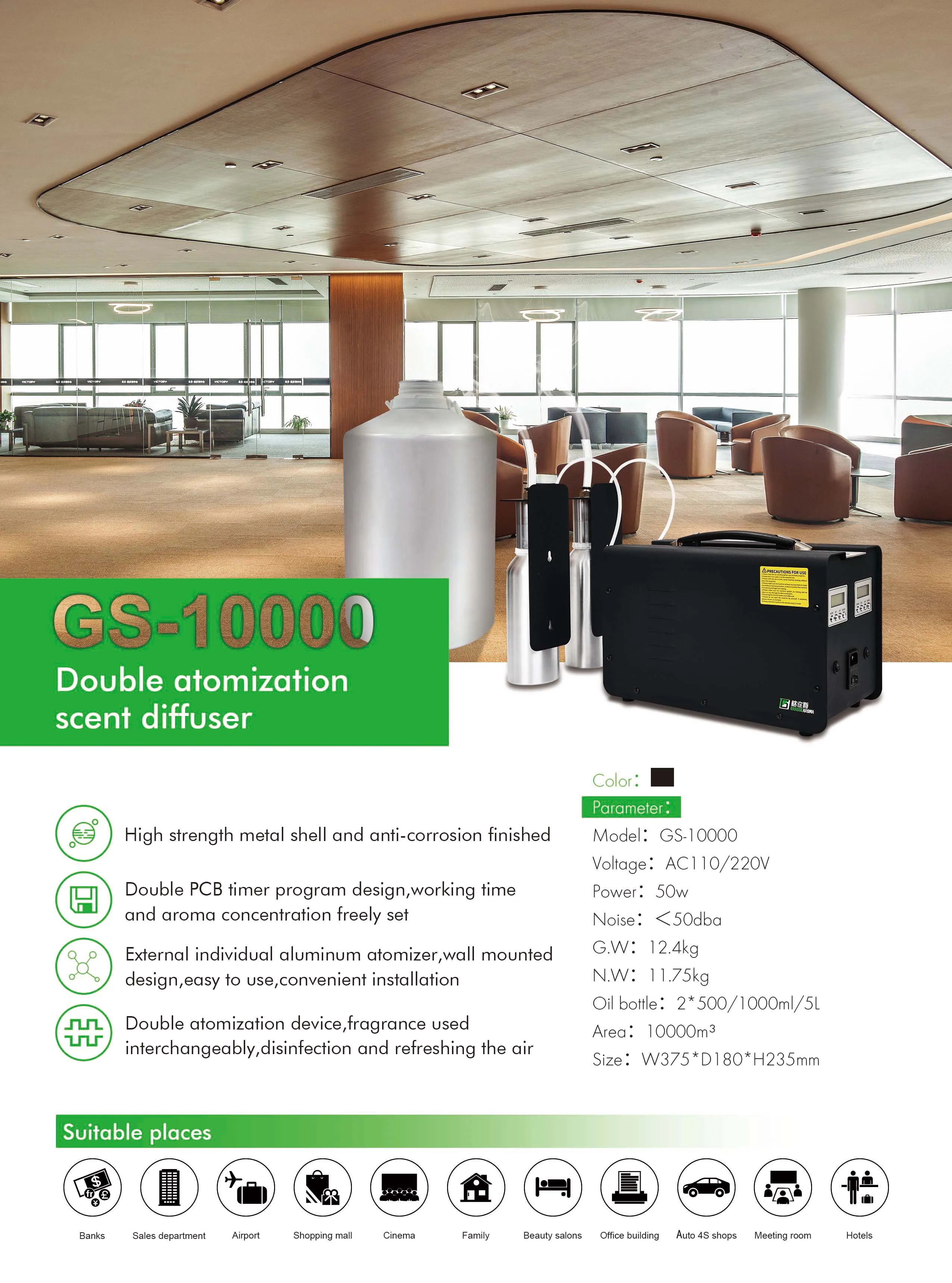 GS-10000 machine with double atomization is for Large commercial area. It uses advanced atomization technology to make the liquid oil into fog ,then can diffuse the fragrance into the air quickly .So that it can cover big area. The machine has a fan installed , it can be used directly to diffuse the fragrance and also can be connected to the HVAC system..It is easy to change oils according to customers' request.