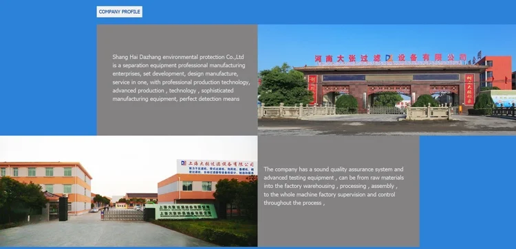 Shanghai Dazhang environment protection Co., Ltd is a separation equipment professional manufacturing enterprises , specialized in design ,manufacture and sales of various filtration equipment as well as comprehensive filtration solutions and projects , our factories cover 250,000 square meters with professional production technology , advanced production technology , sophisticated manufacturing equipment.