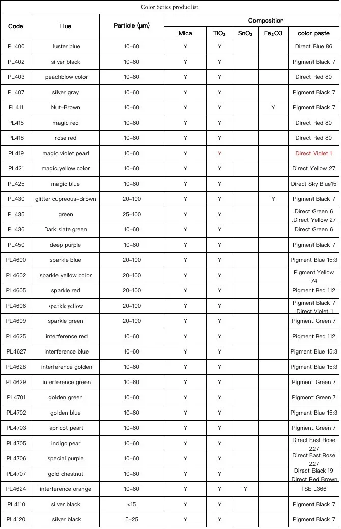 Below is our Color Series Pearlescent Pigment .We also supply Crystal Silver white series, Crystal gold series , Interference Series , Diamond Dragon Pearlescent Pigment series, Chameleon , Optically Variable pigments ,also other natural mica or Synthetic mica or glass substrate pearlescent pigments in other pages , welcome to enquiry!