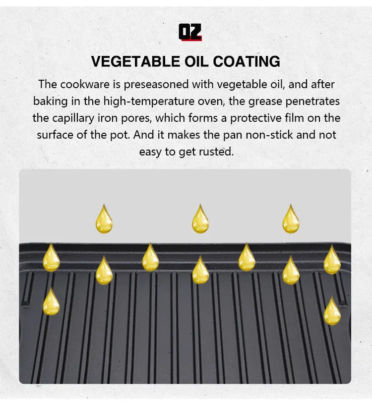 For enamel coating, it's physically non-stick, the non-stick level of our cast iron pans is level two, the non-stick effect is like the steamed rice pot. We can send you the video that show you how to pre-seasoned the cast iron pots and we also can offer you care instruction together with products and It is easier for your customer to know how to improve the non-stick performance.