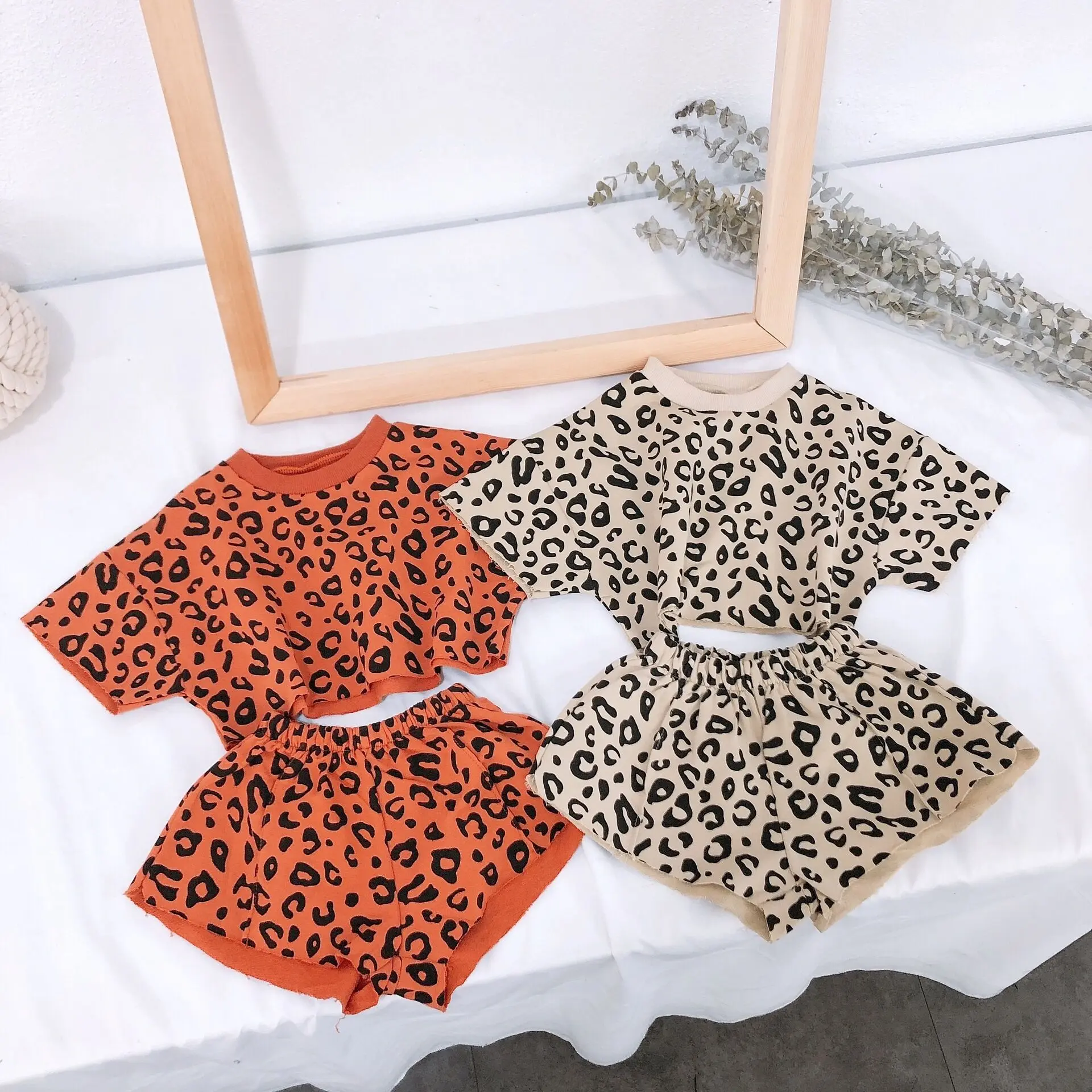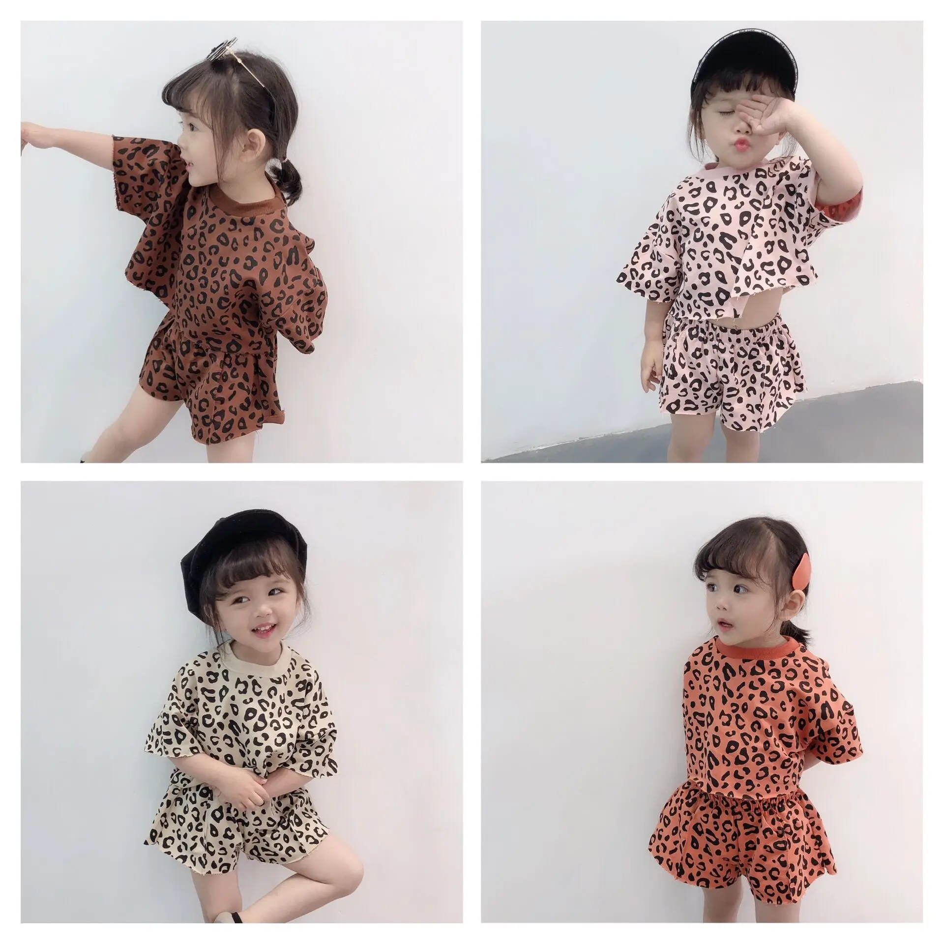 Wholesale summer girls' clothing sets short sleeve crop tops and shorts leopard print suit