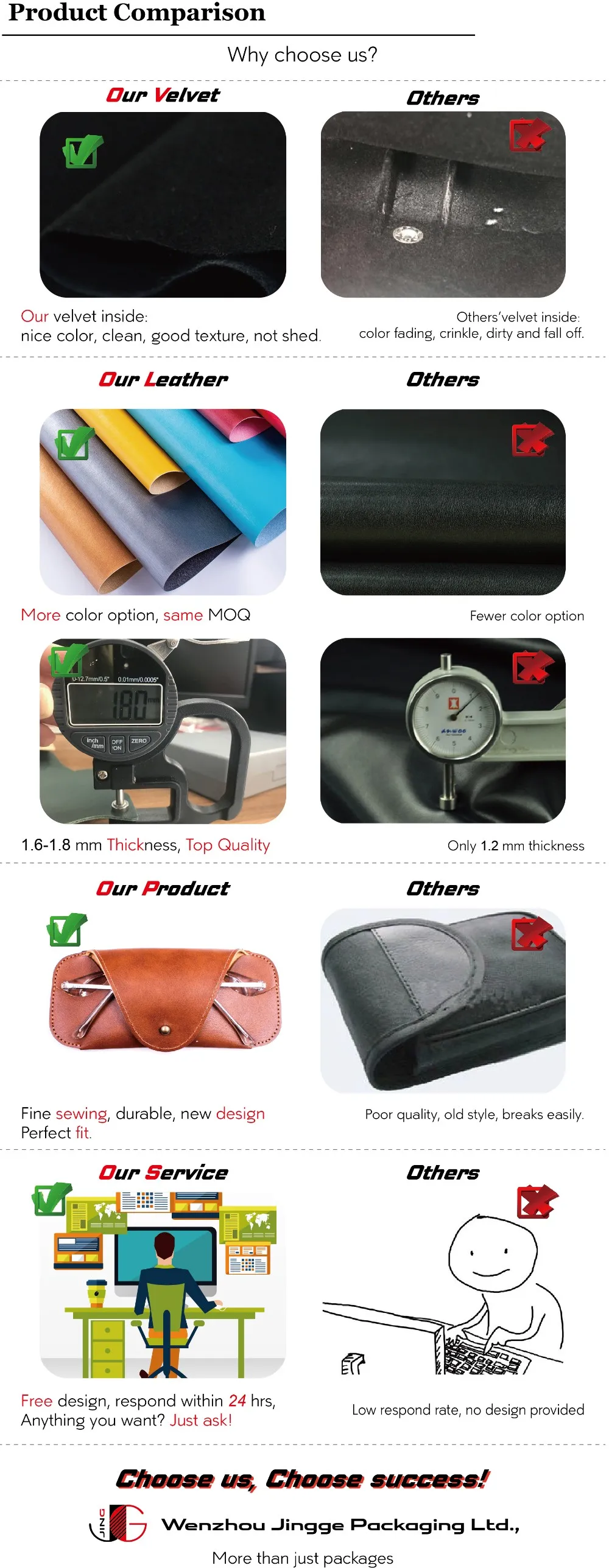 Our MOQ differs in different products. We have no MOQ for products that already has stock, 500 pcs for glasses cords, 2000 pcs for leather bags, 3000 pcs for hard cases and 3000 pcs for small pouches and cleaning cloth.