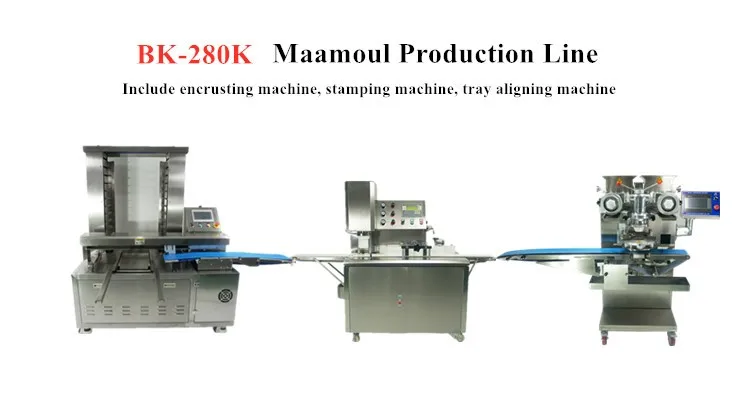 BK-280 Arabic date filled biscuit maamoul making encrusting machine use Mitsubishi's human-computer interface, PLC, Siemens optoelecronic switch, Taiwan driving motor and Japanese complete sets of knives, machine body all parts use high quality stainless steel to make sure the machine keep steady. Safe and healthy.