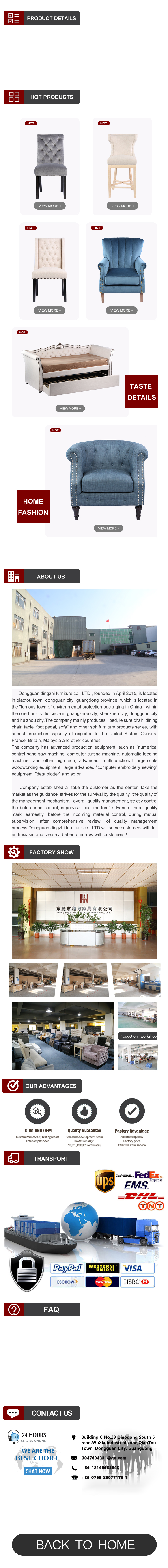 Dongguan Dingzhi Furniture Co.,Ltd. Is located in Dongguan China,the center area of Guangdong Hongkong Macao Greater Bay Area,Until 2019,with 16 years of experience in furniture production and export.Dingzhi furniture is expert and one of leading provider in luxurious bed,daybed,dining chairs,bar chairs,lounge chairs,sofas,tables etc.manufacturing sits has 15,000 square meters and around 300 employees.Professional and strong R&D team can provide fashion,diverse and customer tailored design,good ability to make products with diversification and serialization,main overseas market are in North America,Europe and The Middle East. |