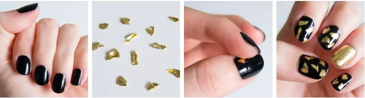 Start with a black base coat. Rip small pieces of the gold leaf, enough to fit about four to five on each nail.