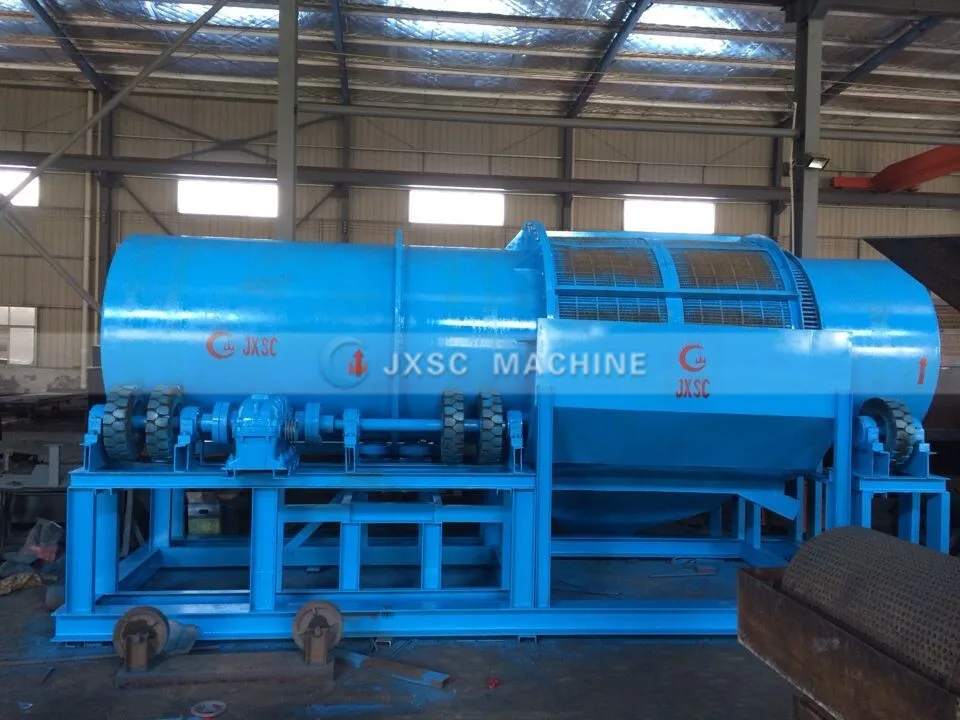 model JXSC-1500, 100t/h capacity, drum diameter 1500mm, length of washing drum 4m, length of screen 2 m, two layers screen (PU +manganese steel material), rubber wheels transmission, manganese steel inner plates, electric motor with 37KW.