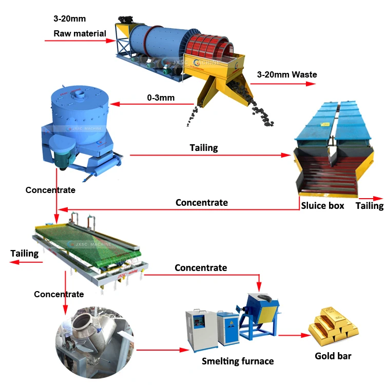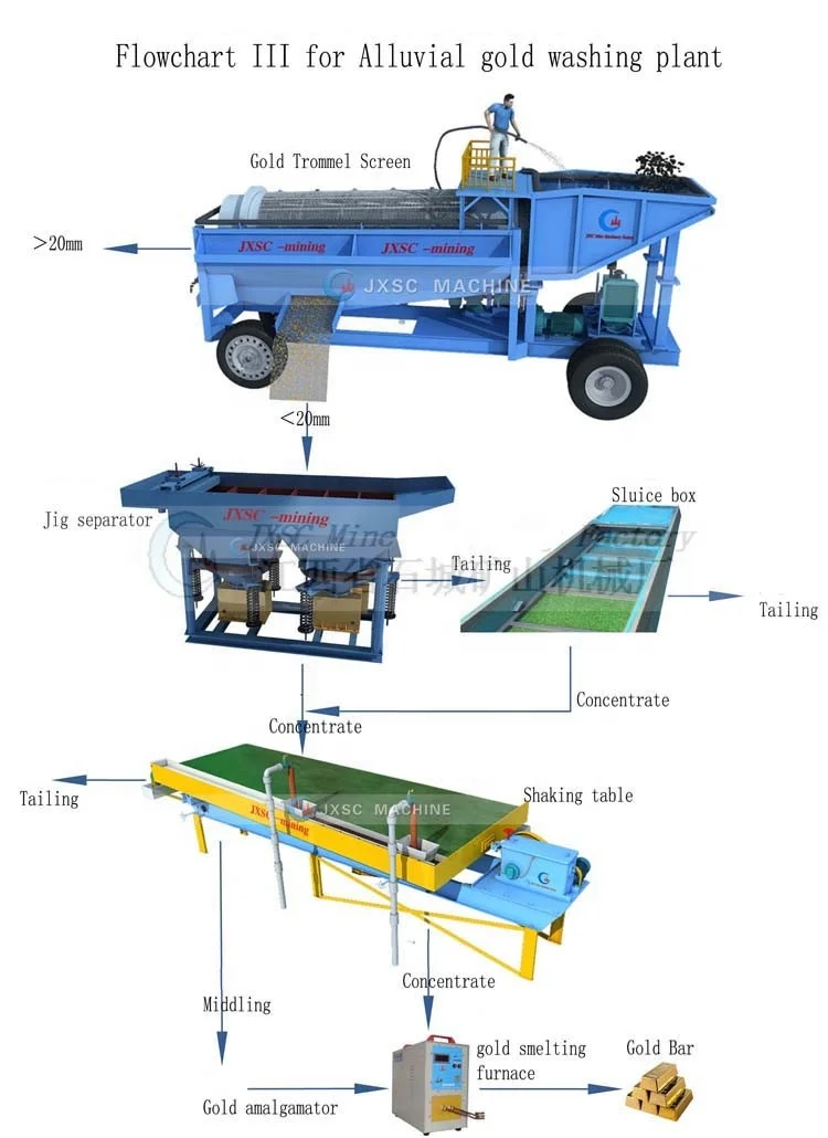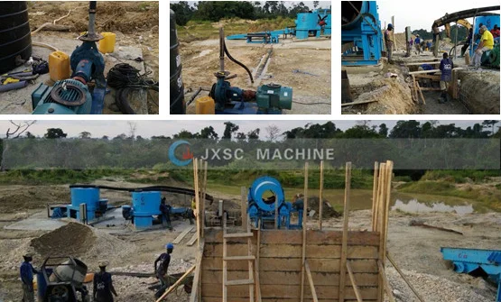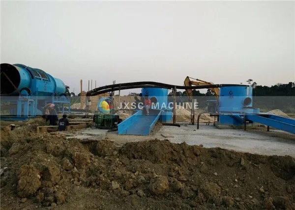 This plant is 100T/H processing capacity, suitable for washing alluvial gold ore with sticky clay. The complete set machines includes 1 set vibration feeder+1 set gold washing trammel scrubber+ 2 sets gold centrifugal concentrator+ 2 sets gold sluice box+1 set 6S shaking table+ 1 set slurry pump+ 1 set water pump+ 2 sets diesel generator+ 1 set belt conveyor.