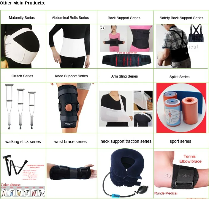 Posture corrector ,Maternity belt , Inflatable cervical collar,Back brace , Knee support ,Ankle Supports , Arm Slings , Finger Splints, Wrist support brace,Tourmaline self-heating products , Medical crutch , Waling stick , Walking aids ,etcs.