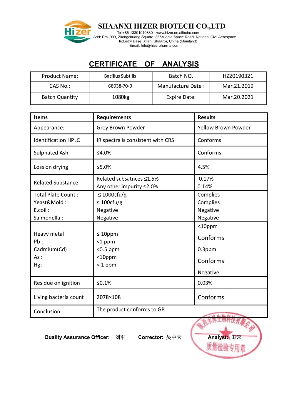 Specification: ≥200×108CFU/g,500×108CFU/g,1000×108CFU/, or according to customer's request.
