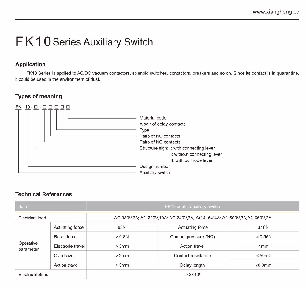Zhejiang Xianghong Electrical Technology Co.,Ltd. is a company of 26 Years experience for manufacturing Auxiliary Switch, Auxiliary Contact , DC contact ,Snap Action switch, limit switch, Micro switch, plastic and metal electrical parts etc. for High Voltage Switchgear or Medium Voltage Switchgear and Vaccum Circuit breaker.
