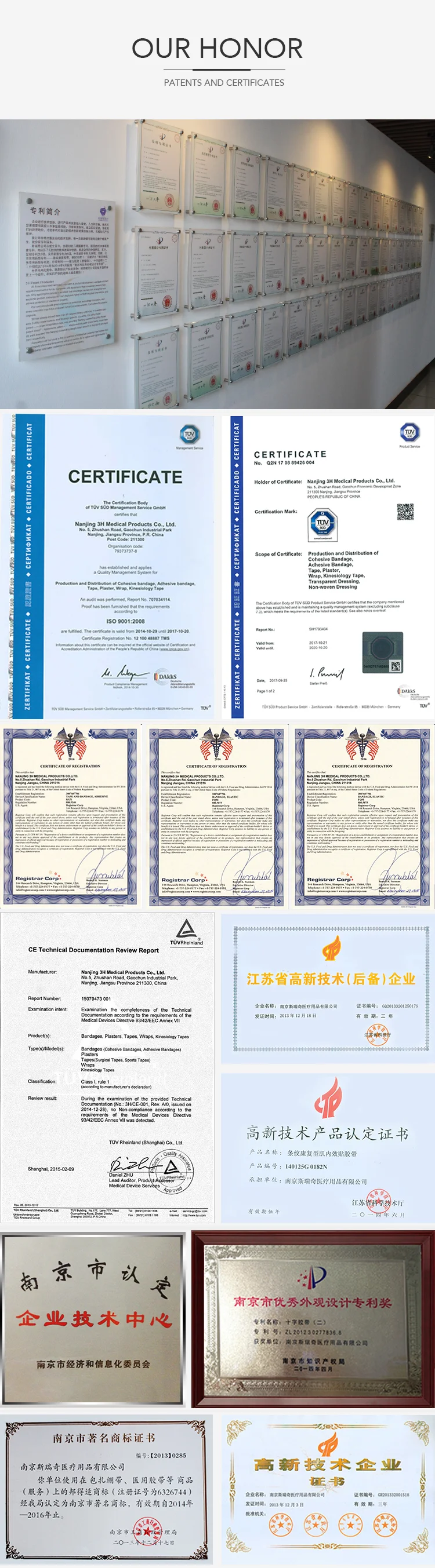 3H Medical Corporation locates in Gaochun Economic Development Zone, Nanjing, China. It’s a new high-tech enterprise specialized in research and production of medical adhesive tape and bandage. The company has a modern workshop of more than 20000 sq.m, including more than 2000 sq.m clean factory. 3H possesses over 60 sets Italy imported equipment , more than 10 production lines and about 300 employees. Besides 3H has passed the Quality System Certification of ISO9001 and ISO13485 and got the CE certificate. The company has it’s own R&D laboratories and the establishment of strategic relations of cooperation with many colleges , and has created enterprise technology center and Nanjing biomedical materials research center, etc.