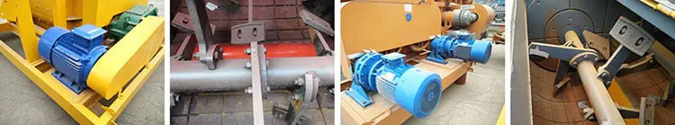 JS750 small concrete mixer mixing system consists of motor, pulley, gearbox, gear, stirring device, mixing drum and other components. The main motor is connected to the secondary gear reduction box through a belt, and finally the two horizontally-connected stirring shafts are respectively rotated by the two pairs of open gears at the same speed.