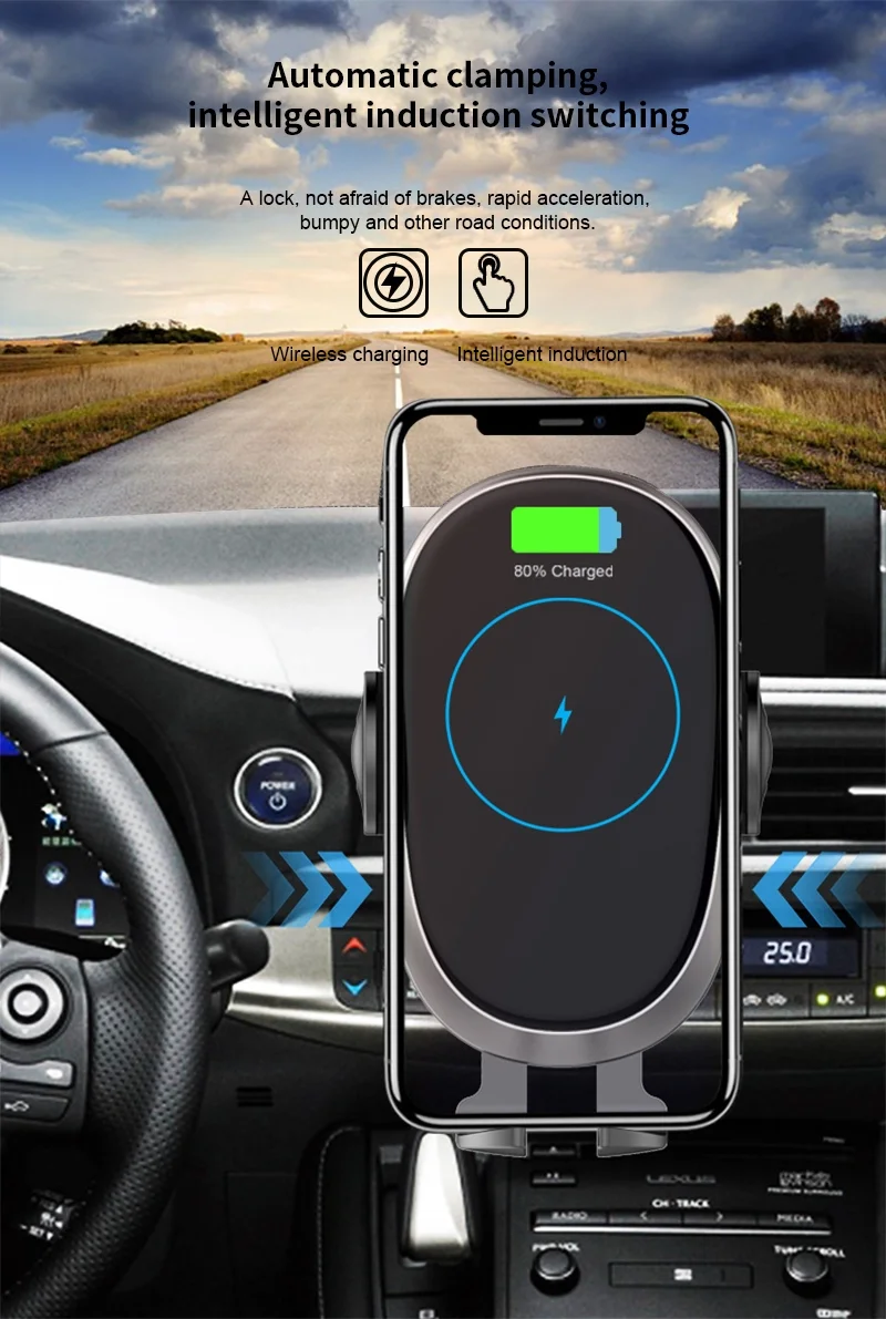 1. Auto Sensor technology: built-in Auto Sensor, two clips can automatically open and clamp the mobile phone, and intelligently detect the precise power of the mobile phone and optimize the charging. When charging, touch the charger head top sensing area, two clips Automatic opening makes it easy to remove the phone. One-hand operation, avoiding misuse and ensuring driving safety