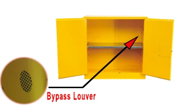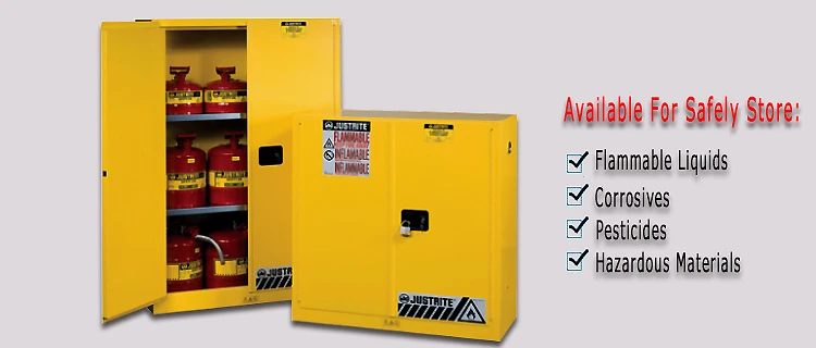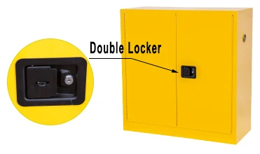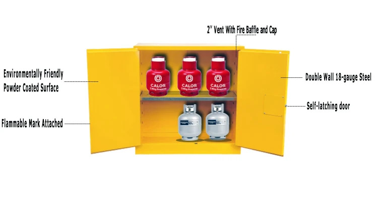 Double walled 18 gauge all-welded steel with 1 1/2" insulating air space. The dual 2" vents of these flammable cabinets allow connecting to an exhaust system. Flammable Cabinets have a recessed paddle handle with cylinder lock. Stainless steel 3-point self-latching system provides positive door locking. Safety storage cabinets include a built in grounding connector and adjustable leveling feet for uneven floors. Durable powder coated finish with trilingual reflective warning label provides high visibility.
