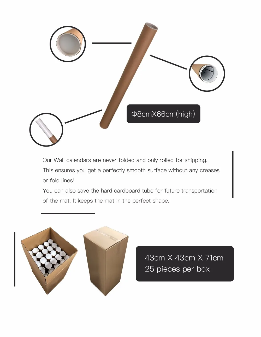 Packing | Round paper tube with plastic cap on top and bottom + carton box(25 tubes per carton) or flat packing with carton box or per customers' request | ||||