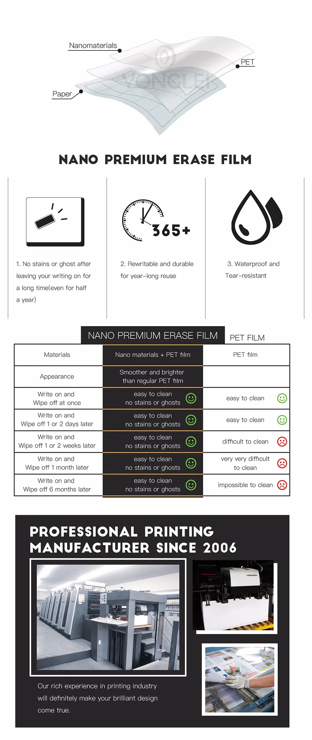 Now we use self-developed nano premium erase film instead of other premium film