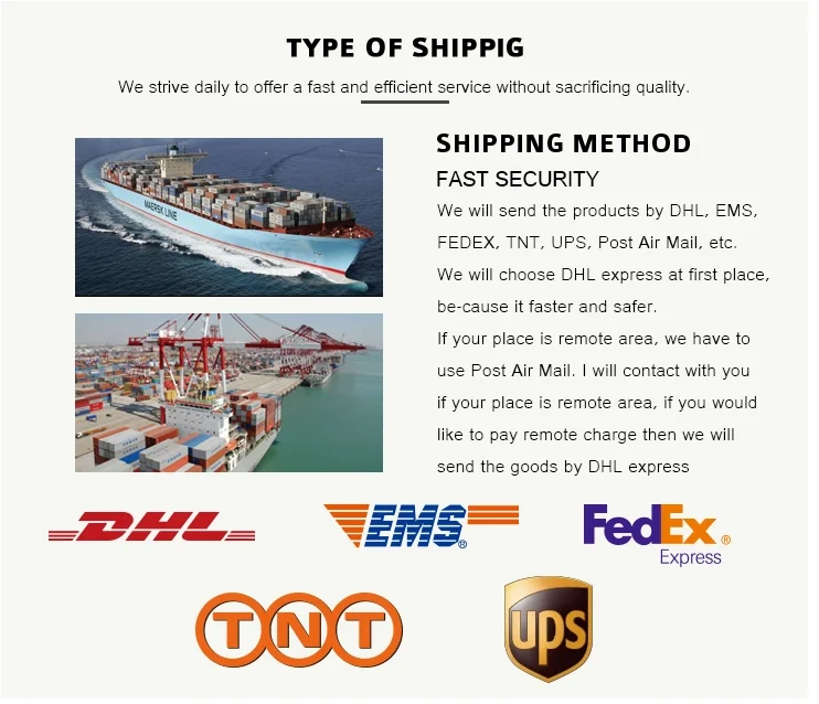 6. How do you ship the goods?A: DHL,UPS,Fedex,TNT,Airline and sea shipping also optional.
