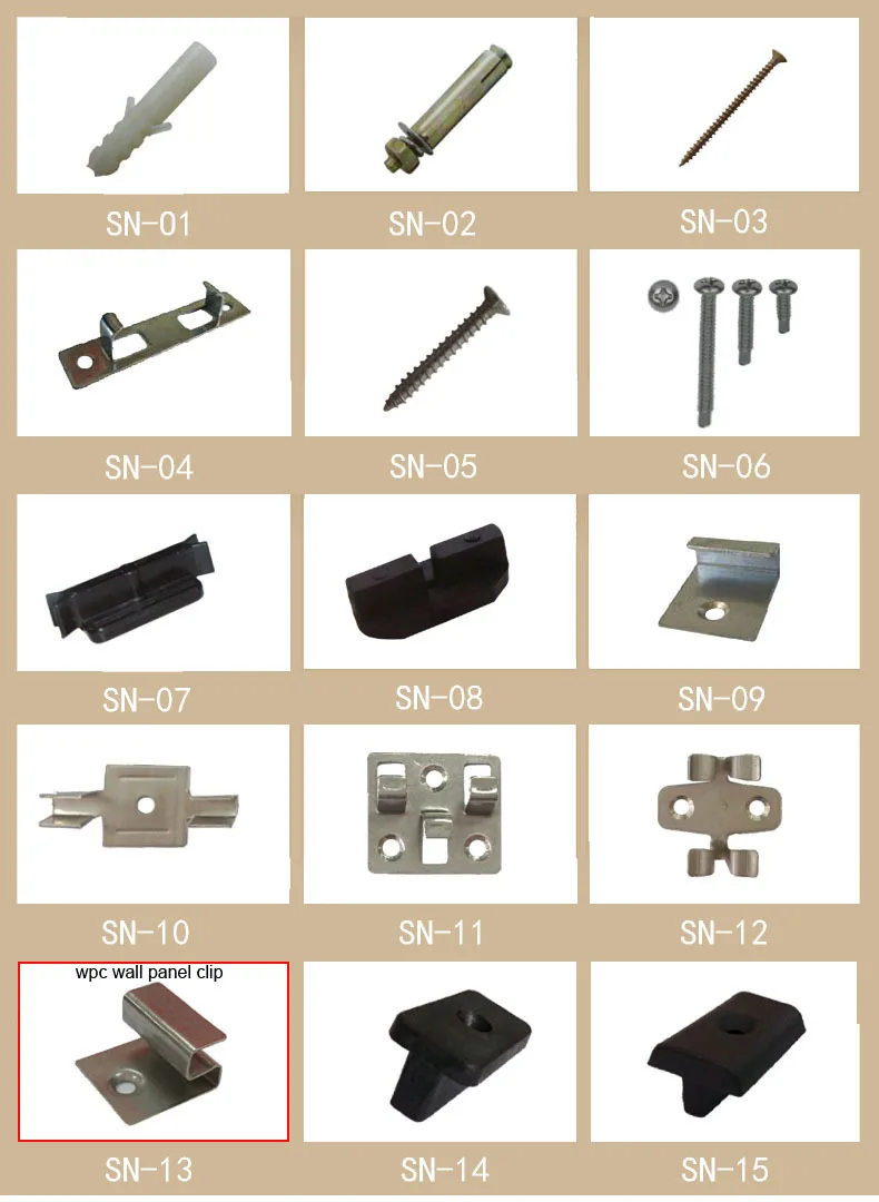 Decking and accessories;1.decking 2.joist 3.metal clip 4.the plastic expansion screws