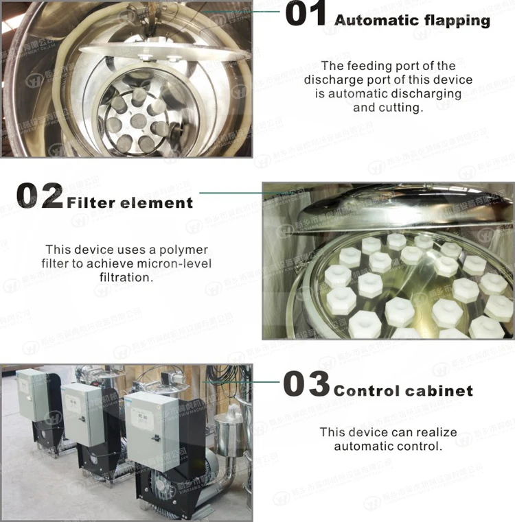Automatic vacuum feeder by a vacuum pump (without oil and water), vacuum hopper, filter (with polyester coated filter, PE filter, filter 316 l stainless steel or titanium filter options), compressed air blowback device, pneumatic feeding gate device, material level automatic control device, stainless steel sucking nozzle, soft tube, etc.