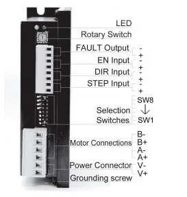 The DT series drives are cost-effective, high performance 2 phases step drives. The design is based on PID current control technology, and feature high torque, low noise, and low vibration. The running current and microstep resolution are switch selectable.