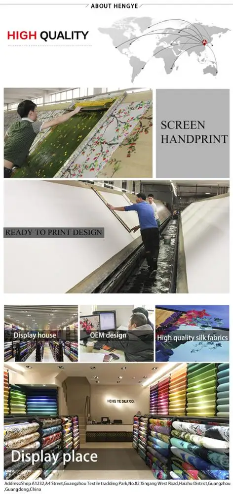 Our Company --HengYe silk Co., Ltd. is located in GuangZhou. The main products are hand print or solid silk satin fabrics and silk georgette fabrics. --We own the complete production process containing, design,dyeing, printing and checking so that we can supply the best quality products to every customer.