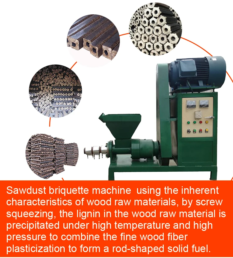 Sawdust briquette machine is also called charcoal machine. It is used to process sawdust, stalk, rice husk and so on. It is a kind of energy reuse equipment. The raw materials are squeezed and heated with high temperature, then the finished sticks will be made. The material's diameter must be less than 5mm and water content is less than 10%.
