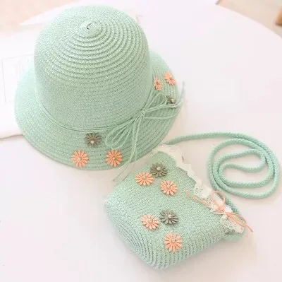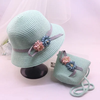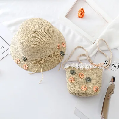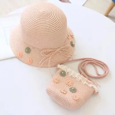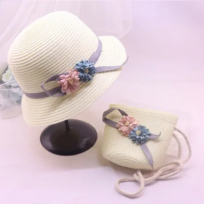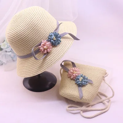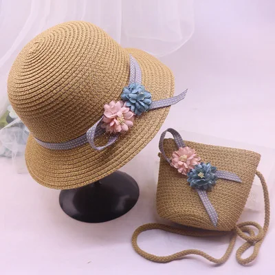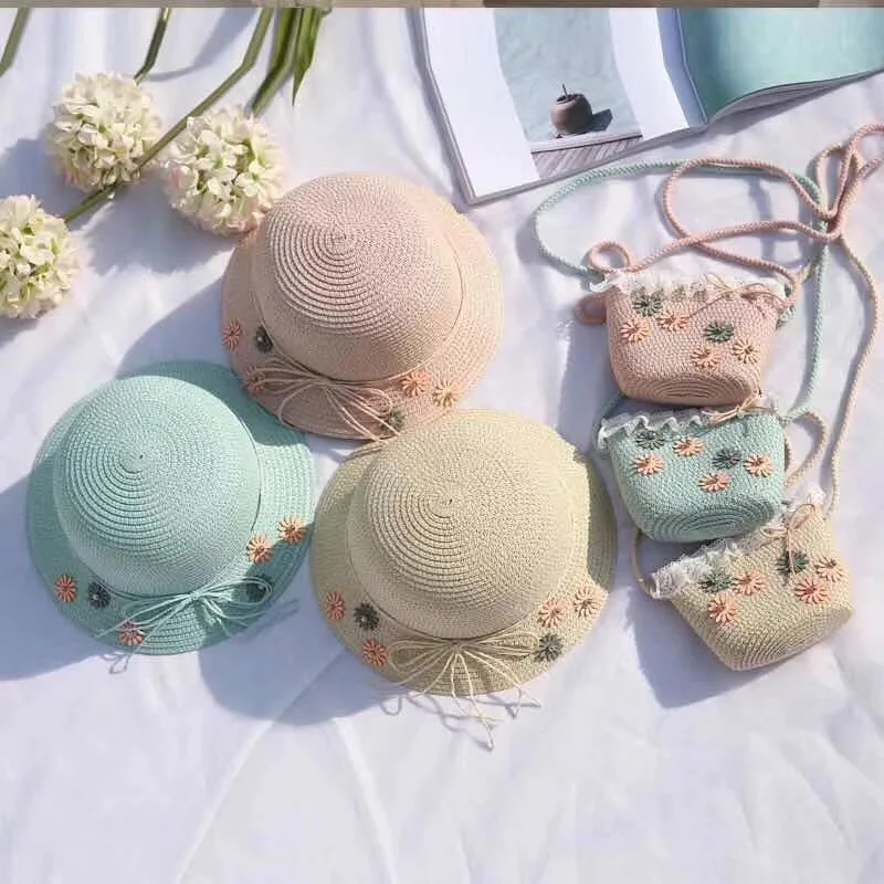 Wholesale Girls Summer Sunhat Straw flower cap Beach wear crochet beanie with matching bag set Mommy&Me Straw hat