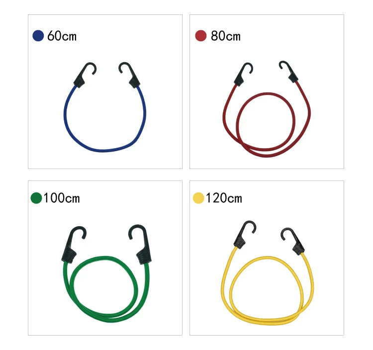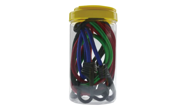 Description | 4 pieces plastic shell hook elastic rope bungee cord set in plastic can |