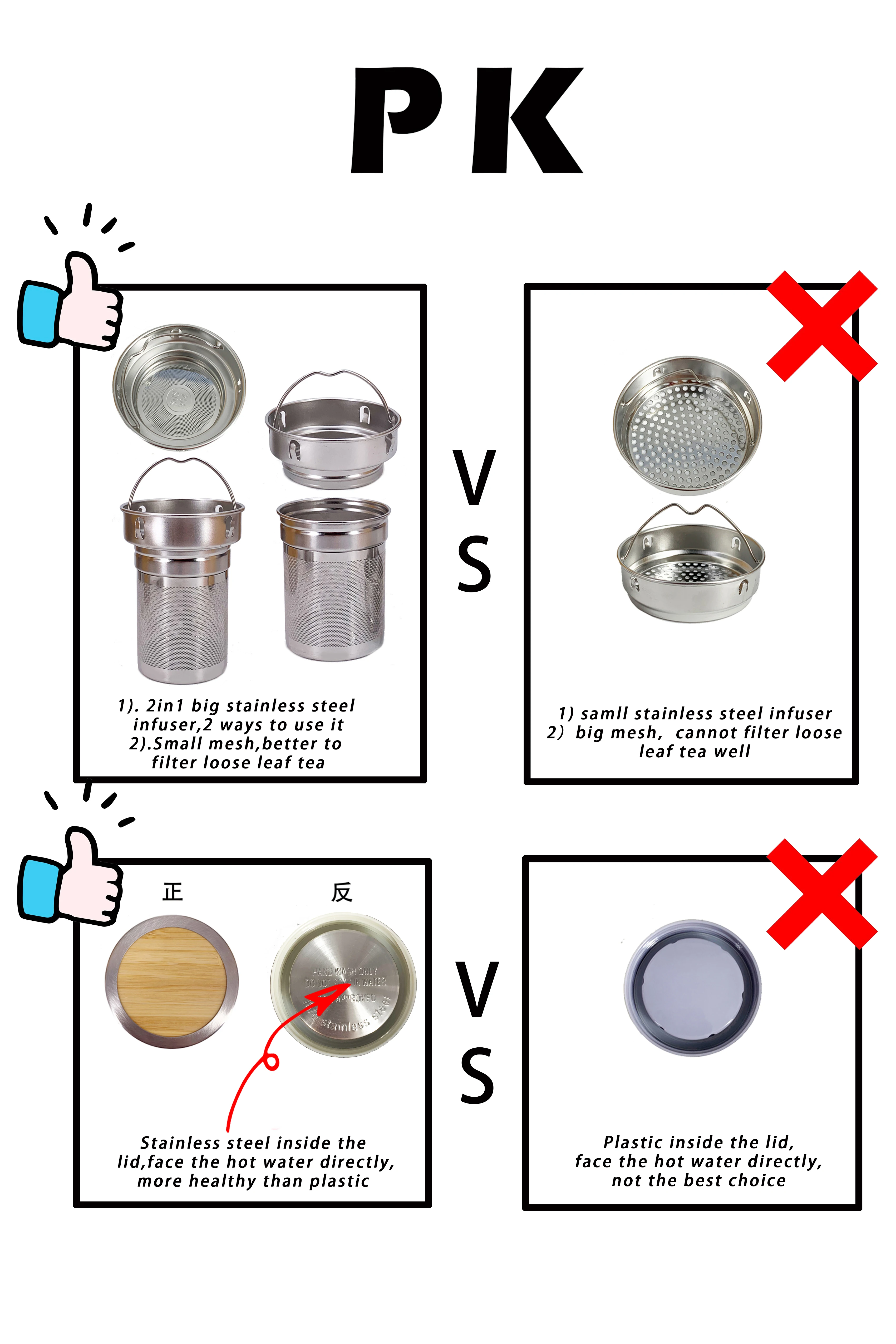 WeDrinking: | 1)Customized logo a. Custimized laser engraved logo on bamboo/steel lid b. Embossed/laser engraved logo on inner steel of lid c. Customized logo engraved on tea infuser 2)Customized packaging a. White box(or with customized printed sticker),no MOQ and sticker free. b. Custimized colour box c. Customized colour tube/cylinder 3)More other accessories We can also provide customized sleeve,bamboo spoon,tea accessories,swing tag,thanks card and so on. | |