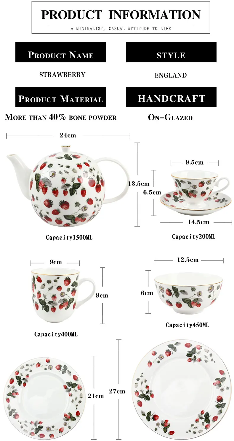 Content | Tea pot *1 Mug *1 Cup and saucer *1 8 " plate *1 10" plate *1 bowl*1 It's available to create the settings as your demand . |