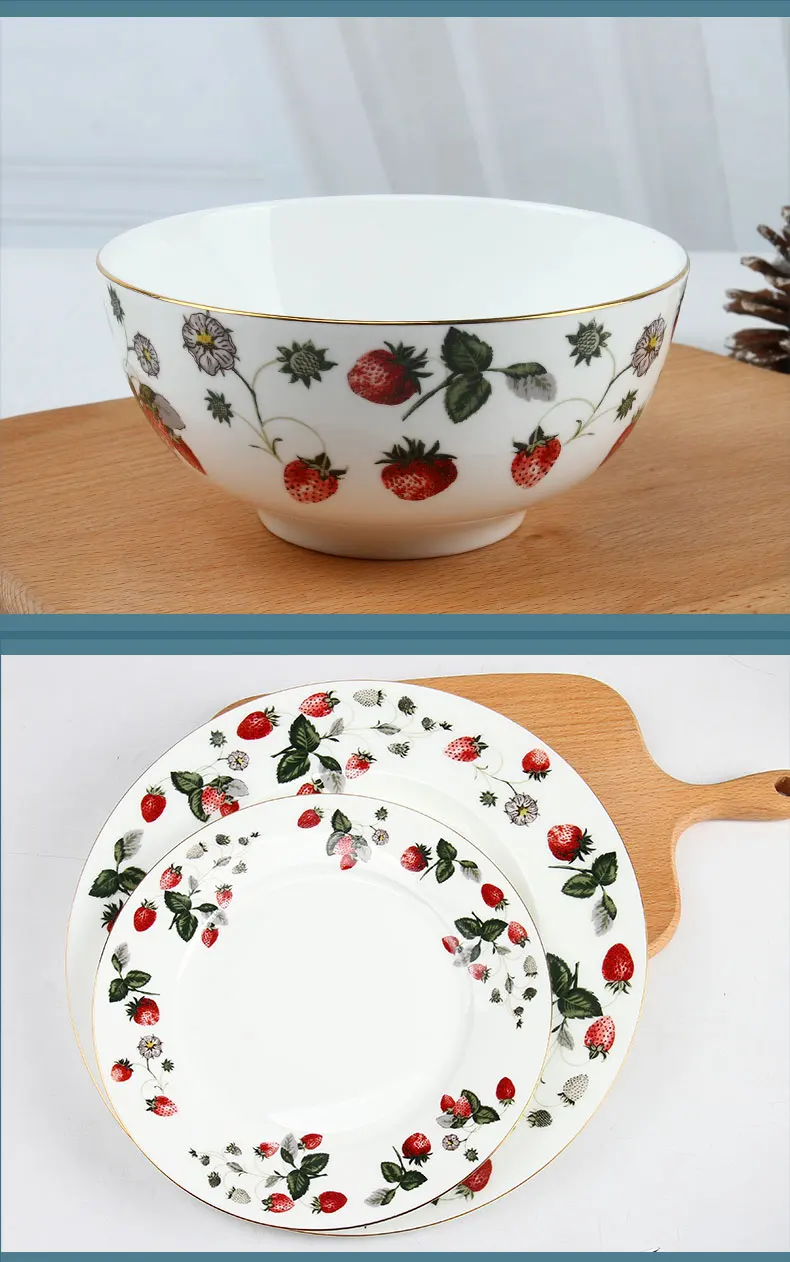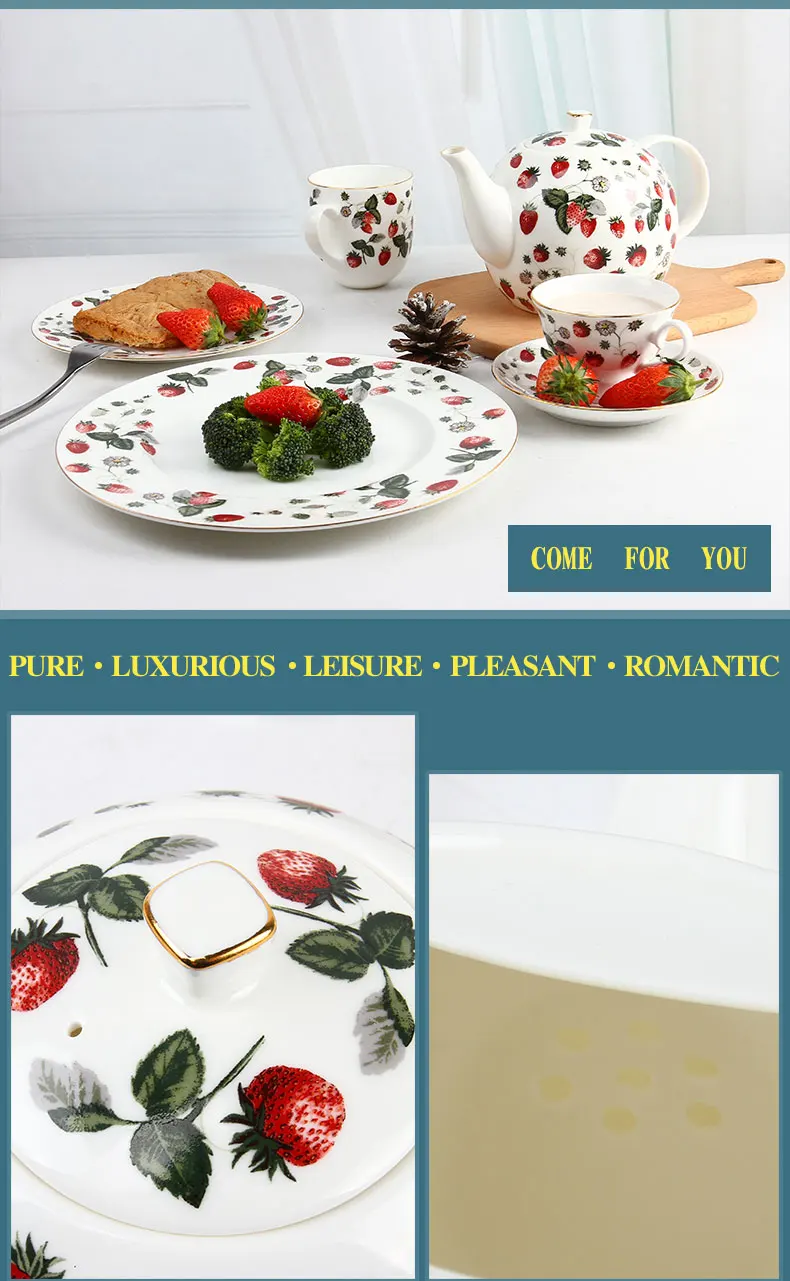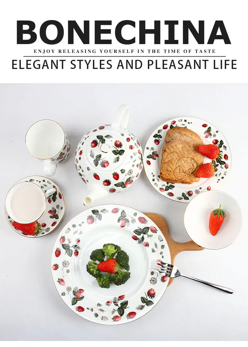 Design concept | The strawberry dinner sets have flash strawberry decals . Even without any food , it looks like the wares are displayed with strawberry . And the wares pied with kinds of cookies ,desserts , the food may look like more delicious . |
