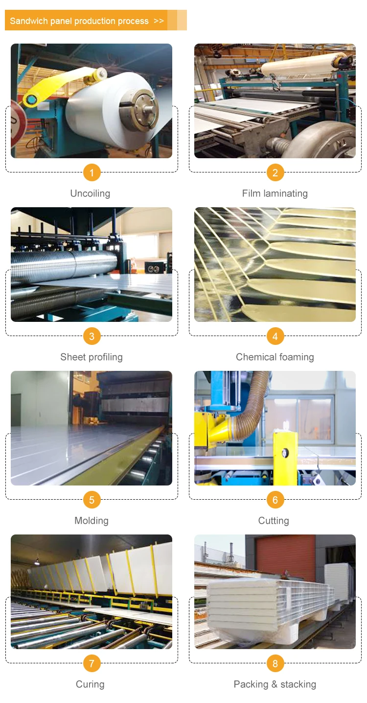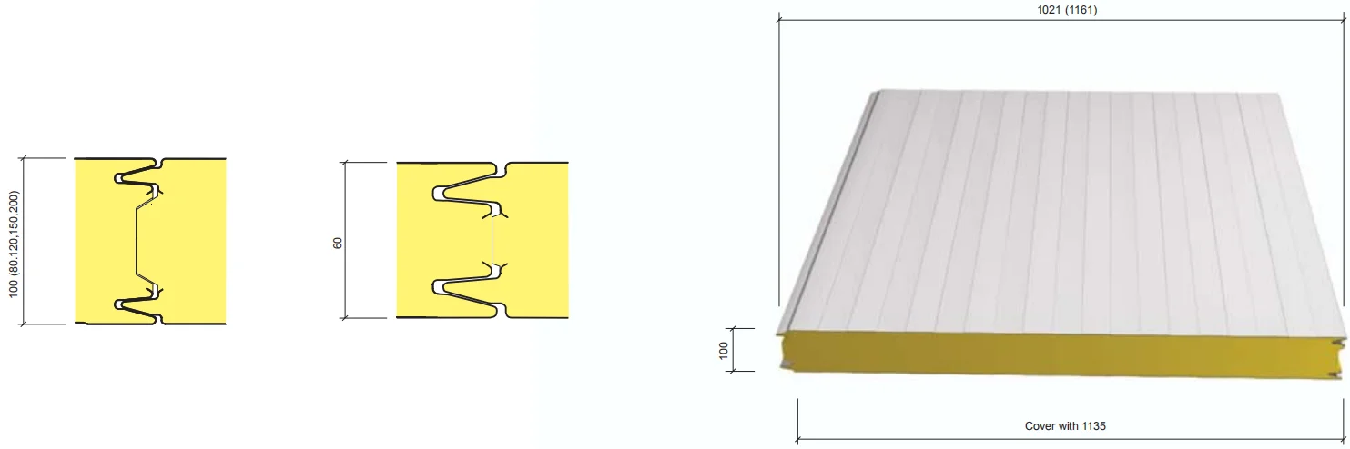 .Cover width : 1135, 1000mm .Panel width : 1061, 1021mm .Thickness : 50,60, 80, 100, 120, 150, 180,200mm .Min. length : 2000 mm .Max. length: 20000 mm .Length to order per 10mm .Tolerances - width : ±2 mm - length : ±5 mm | External facing : - steel plate thickness 0.4 - 0.8mm Internal facing : - steel plate thickness 0.4 - 0.8mm FINISHING LACQUER : .Polyester - 25μm .PVDF - 25μm .HDP - 25μm | Foam density : 40kg/m3 (±2kg/m3) Thermal conductivity : 0.023 W/mK Weight of panel : 60mm = 12.50kg/m2 80mm = 13.40kg/m2 | ||