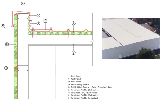 Surface : - Linear - Micro-Linear - Ribbed - Flat Edge profiles: Water proofing tongue & groove edge - Hidden fixing with omega flashing design | .Multi standard RAL colour .Order for special colour Protection film : .50 micron PVC film on both side OPTION : .Skylight .Louver .Gutter | Foam density : 40kg/m3 (±2kg/m3) Thermal conductivity : 0.023 W/mK Weight of panel : 60mm = 12.50kg/m2 80mm = 13.40kg/m2 | ||