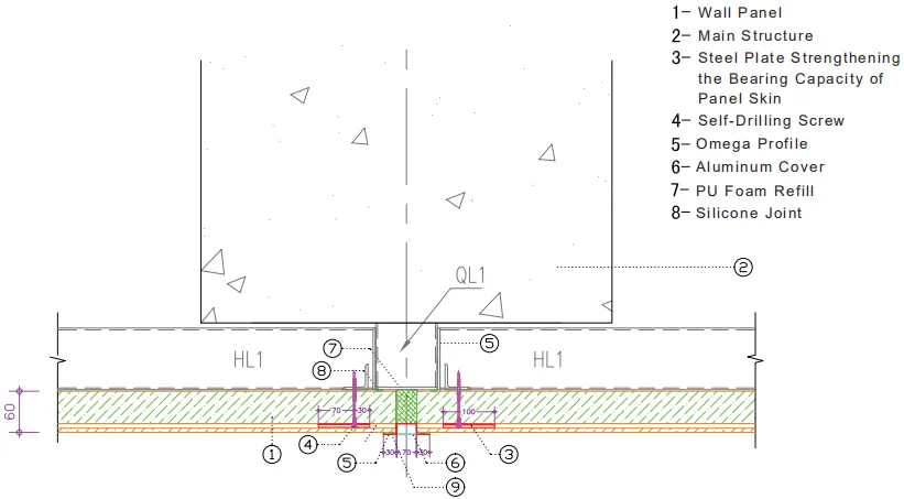 APPEARANCE : .Surface : - Linear - Micro-Linear - Ribbed - Flat .Edge profiles: Water proofing tongue & groove edge Hidden fixing with omega flashing design | COLOUR : Multi standard RAL colour . Order for special colour Protection film : 50 micron PVC film on both side | FOAM DENSITY : 40kg/m3 (±2kg/m3) Thermal conductivity : 0.023 W/mK Weight of panel : 60mm = 12.50kg/m2 80mm = 13.40kg/m2 | ||