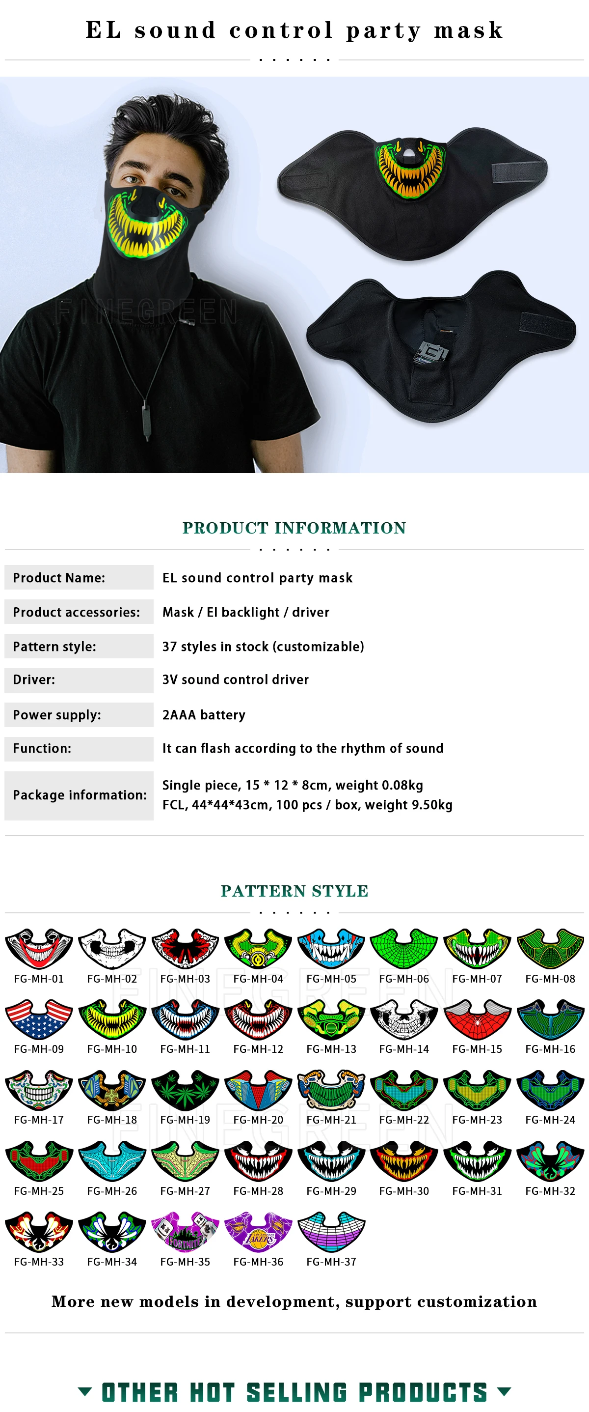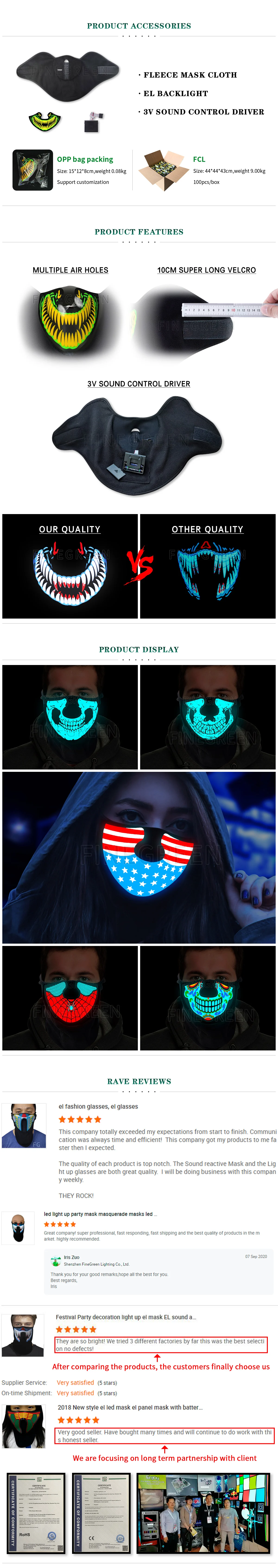 Finegreen el lighitng masks with newest patent design ,when having music or sound ,the el panel will light ups.