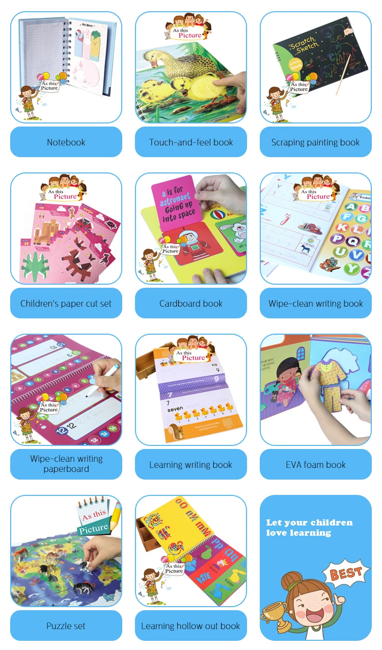 Cover material: 250 gsm coated paper,4c+4C printing ,glossy lamination Children can prastic to write and learn letters and numbers, and can help kids to know different colors of different animals, fruit or plants etc. and love learning