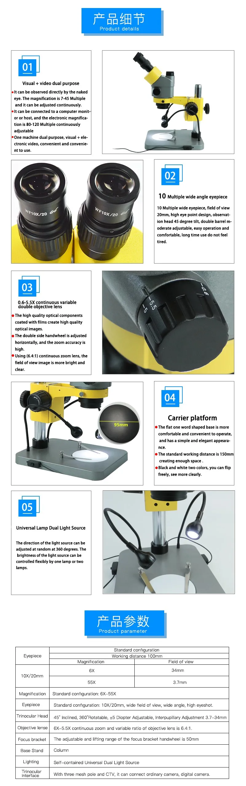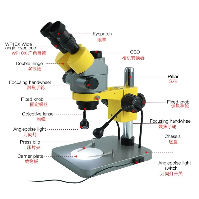 45°inclined 360°rotatable trinocular head, with the bigger base , allow more works;