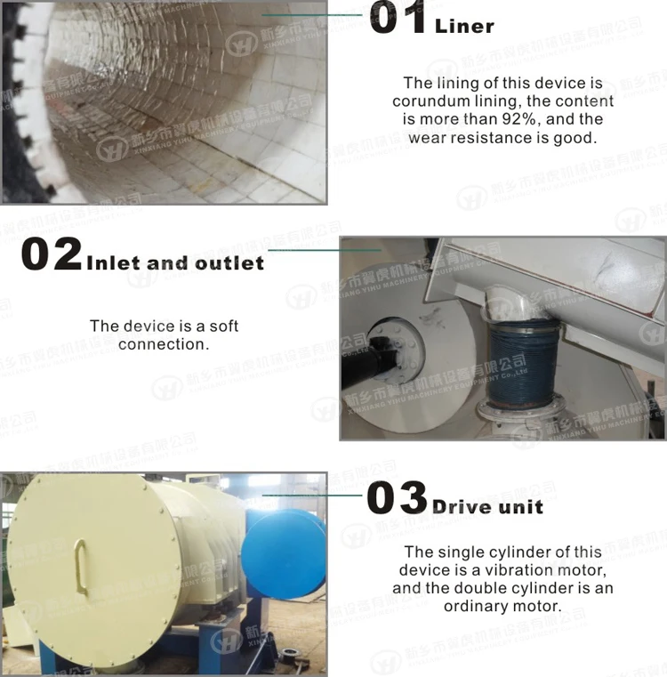 The high efficiency vibration mill is mainly composed of the base frame, the body frame, the acoustic enclosure, the body, the grinding cylinder, the vibrator, the lining plate, the spring support, the grinding medium and the driving motor.