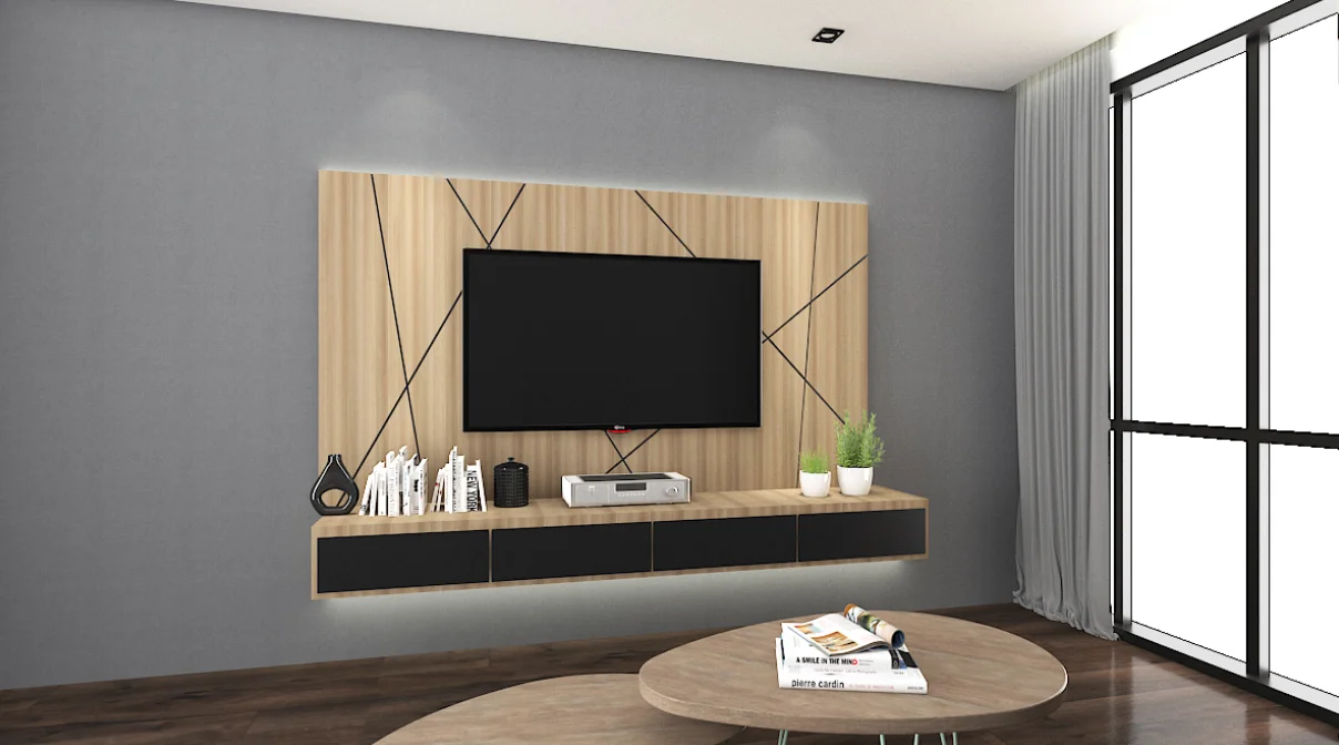 This modern melamine TV cabinet design is ideal for a smaller living room as it is fully wall-mounted, providing a clear floor space that keeps the room clutter free. The TV can be wall-mounted onto the cabinet, with the wiring running behind it. Four deep drawers are provided to store your media collection, and there is plenty of display area below the TV. You can also add optional under-cabinet lighting to enhance the floating effect.