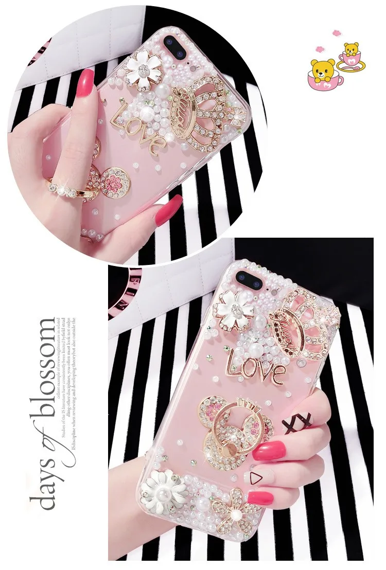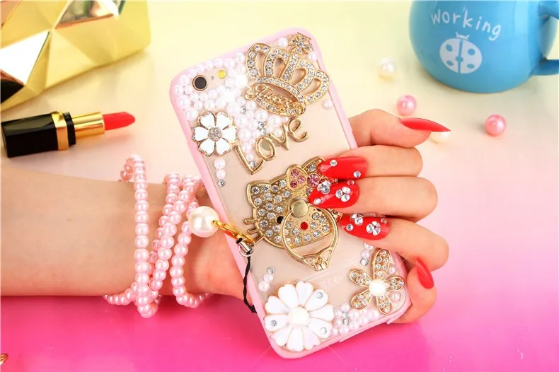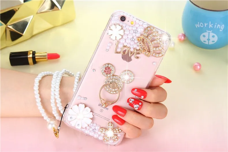 Pearl encrusted phone cases luxurious with diamond mobile phone bags & case with strap for women for iPhone