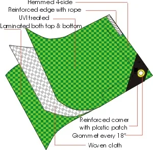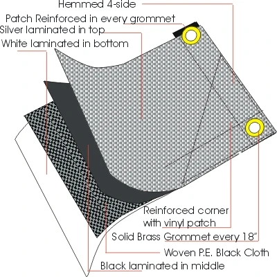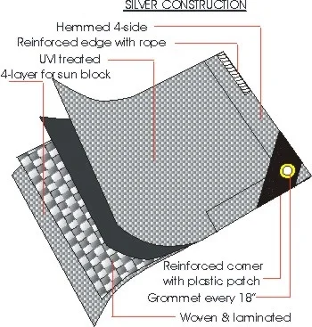 14 X 14 MESH COUNT, 12 MIL THICKNESS,BLACK YARN, BLACK AND SILVER COATED, CORNER REINFORCED, ULTRA VIOLET 3% TREATED, 100% SUN BLOCK, WATER PROOF, MILDEW, AND ROT RESISTANCE.