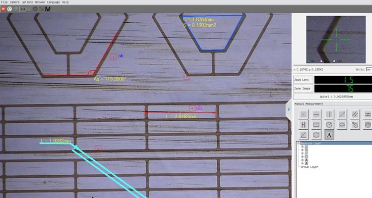 arbitrary polygon measuring , etc.Measurement data can be saved ,can also be generated by EXCEL, you can import or export. Numerical units are free to select (mm, um,inch mil), can select size and color of the Mark data.