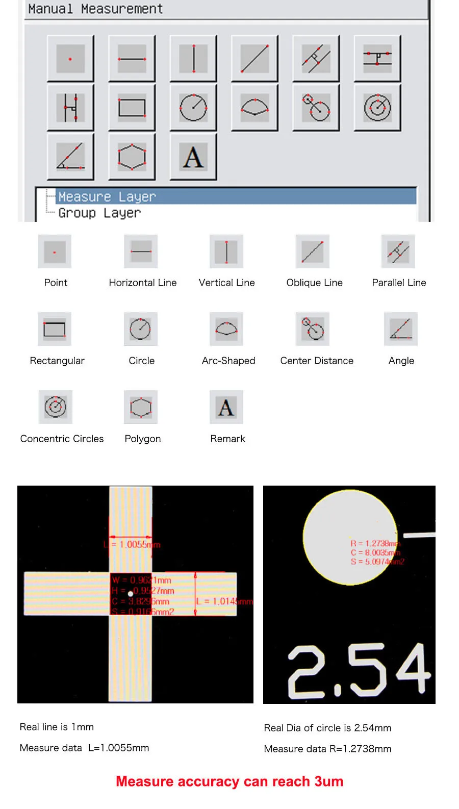 Measurement function | Can measure lines, parallel lines, circles, arcs, angles, concentric circles, center distance of circles, rectangles, polygons and other plane graphics (support customized measurement mode) | ||
