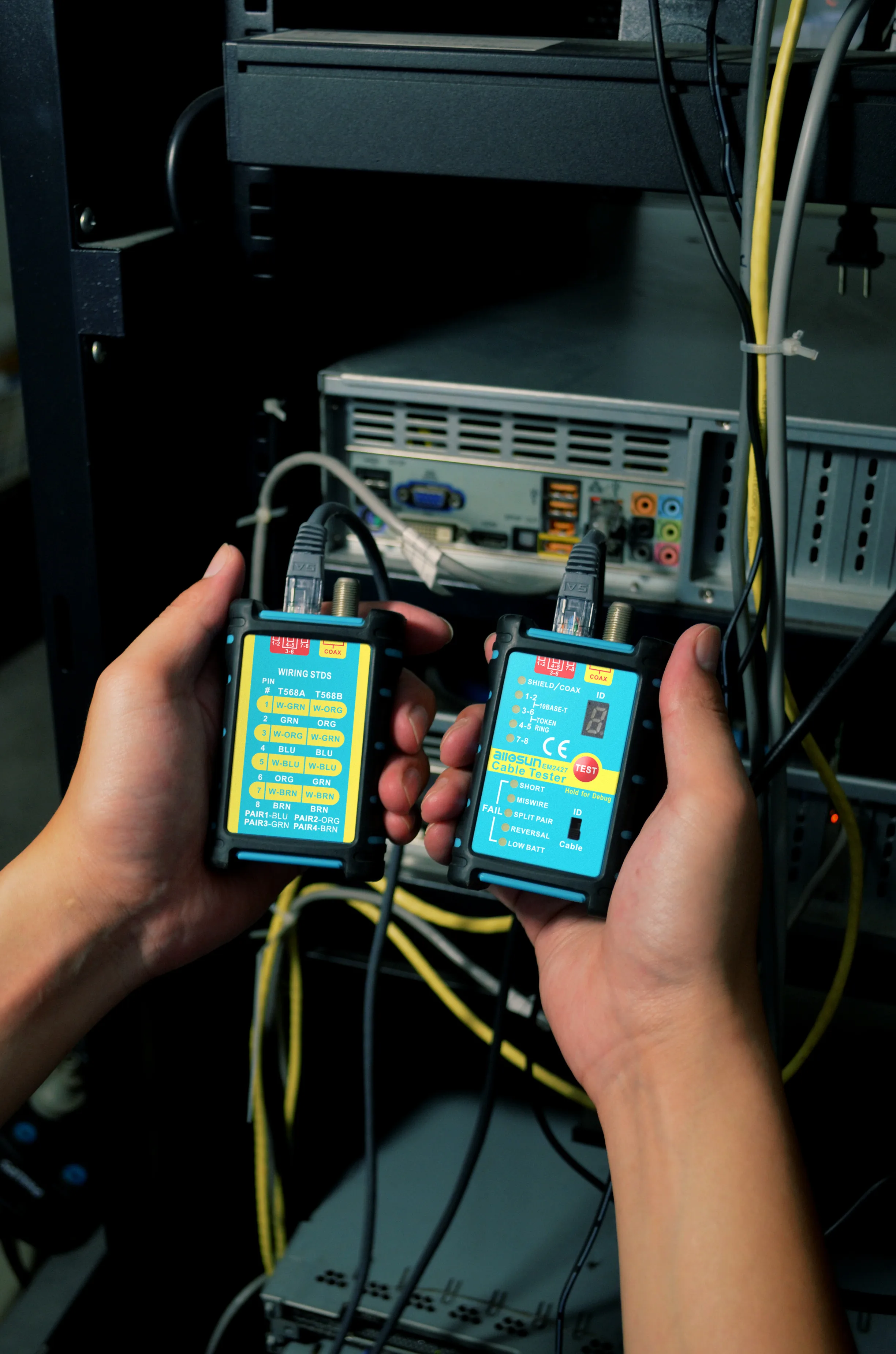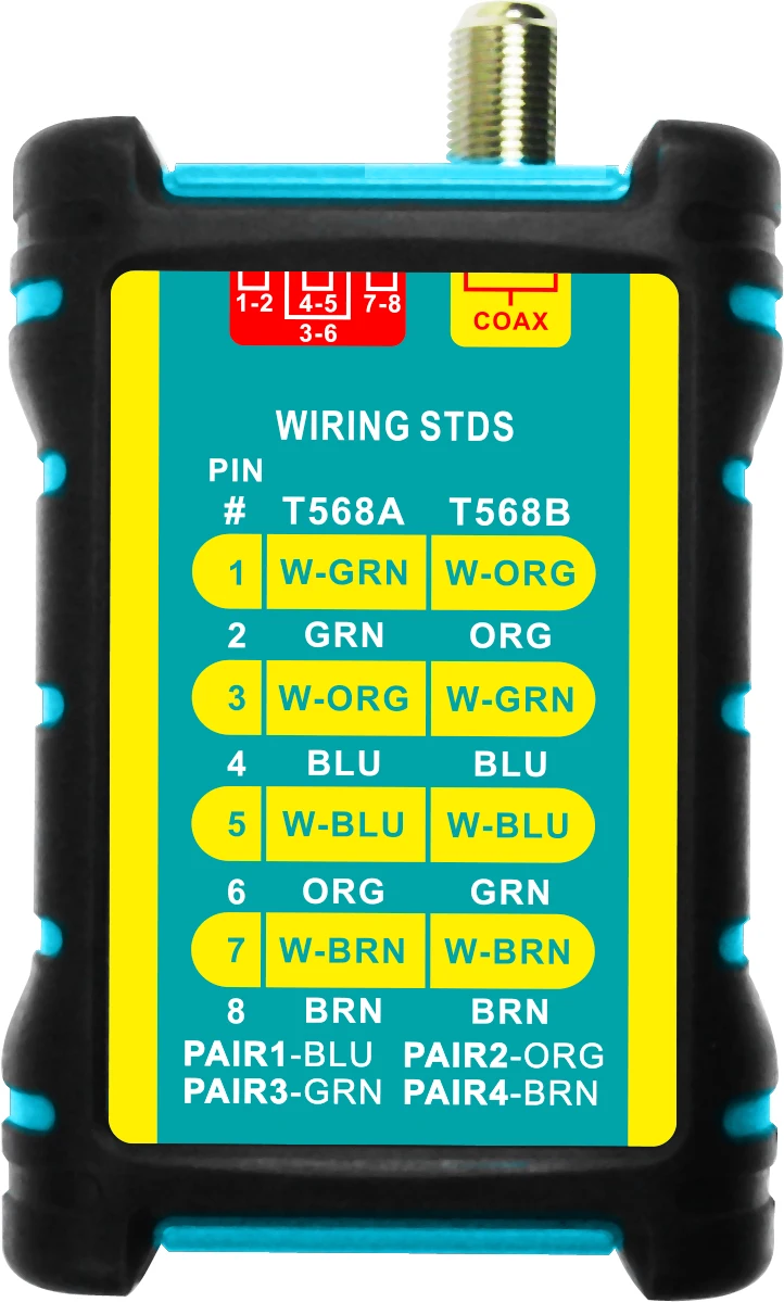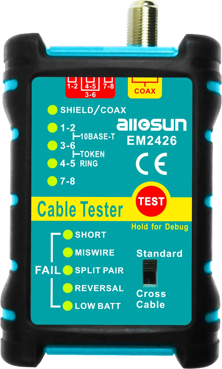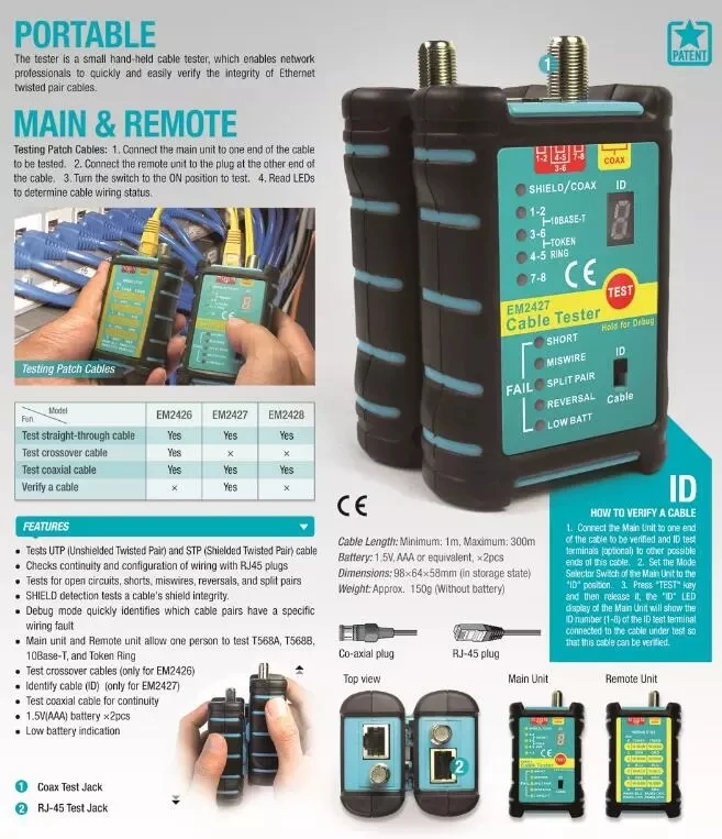 General Information The tester is a small hand-held cable tester, which enables network professionals to quickly and easily verify the integrity of Ethernet twisted pair cables. Main & Remote Testing Patch Cables: 1. Connect the main unit to one end of the cable to be tested. 2.Connect the remote unit to the plug at the other end of the cable. 3.Turn the switch to the ON position to test. 4.Read LEDs to determine cable wiring status. FEATURES * Test UTP (Unshielded Twisted Pair) and STP(Shieled Twisted Pair) cable * Checks continuity and configuration of wiring with RJ45 plugs * Tests for open circuits, shorts, miswires, reversals, and split pairs * SHIELD detection tests a cable's shield integrity * Debug mode quickly identifies which cable pairs have a specific wiring fault * Main unit and remote unit allow one person to test T568A, T568B, 10Base-T and Token Ring * Test crossover cables (only for EM2426) * Identify cable(ID) (only for EM2427) * Test coaxial cable for continuity * 1.5V (AAA) battery 2 pcs * Low battery indication